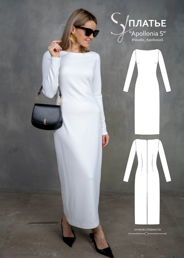 Выкройка трикотажного платья приталенного силуэта умеренного объёма с овальной горловиной типа «лодочка», обработанной обтачкой. Конструкция переда предполагает перевод нагрудных вытачек в боковой шов; на спинке выполнен средний шов с застёжкой на потайную молнию и талиевые вытачки, при этом по низу среднего шва обработан высокий разрез. Рукав длинный, прямой, одношовный, прилегающего объёма. Длина изделия выше линии щиколоток.
